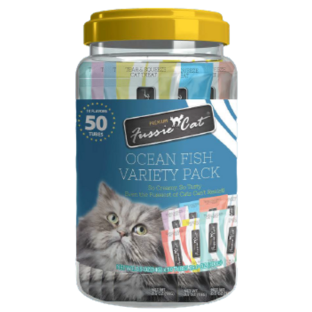 Fussie Cat Treat Puree Ocean Fish Variety Pack 10 Flavors 50/Tub